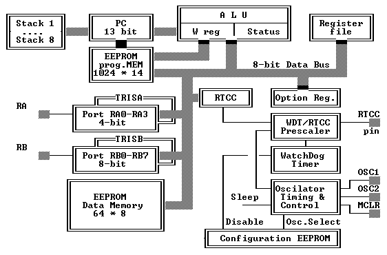 Периферия включает в себя 8-битный таймер/счетчик с 8-битным программируемым предварительным делителем (фактически 16 - битный таймер) и13 линий двунаправленного ввода/вывода. Высокая нагрузочная способность (25мА макс. втекающий ток, 20 мА макс. вытекающий ток) линий ввода/вывода упрощают внешние драйверы и, тем самым, уменьшается общая стоимость системы. Разработки на базе контроллеров PIC16C84 поддерживается ассемблером, программным симулятором, внутрисхемным эмулятором (только фирмы Microchip) и программатором.