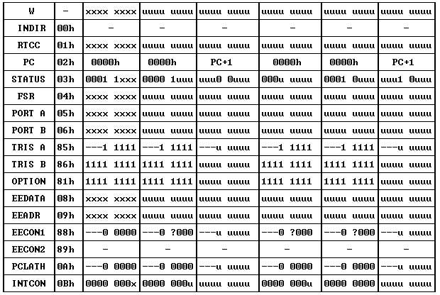 При первом событии происходит сброс всего устройства. Два других события предполагают продолжение выполнения программы. Бит "PD" в регистре статуса (f3), который устанавливается при включении, но обнуляется командой "SLEEP", может быть использован для определения состояния процессора до "просыпания": или процессор был в режиме "SLEEP"(горячий старт), или было просто выключено питание (холодный старт). Бит "TO" позволяет определить, чем был вызван выход из режима SLEEP: или внешним сигналом на ножке /MCLR, или срабатыванием WDT.