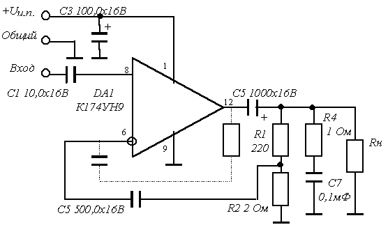 Для уменьшения коэффициента усиления допускается изменение сопротивления резисторов R1 и R2. Допускается применять конденсаторы емкостью: С1 = 1…10 мкФ, С2 = 100…500 мкФ, С5 = 1000…2200 мкФ, не приводящих к изменению электрических параметров.