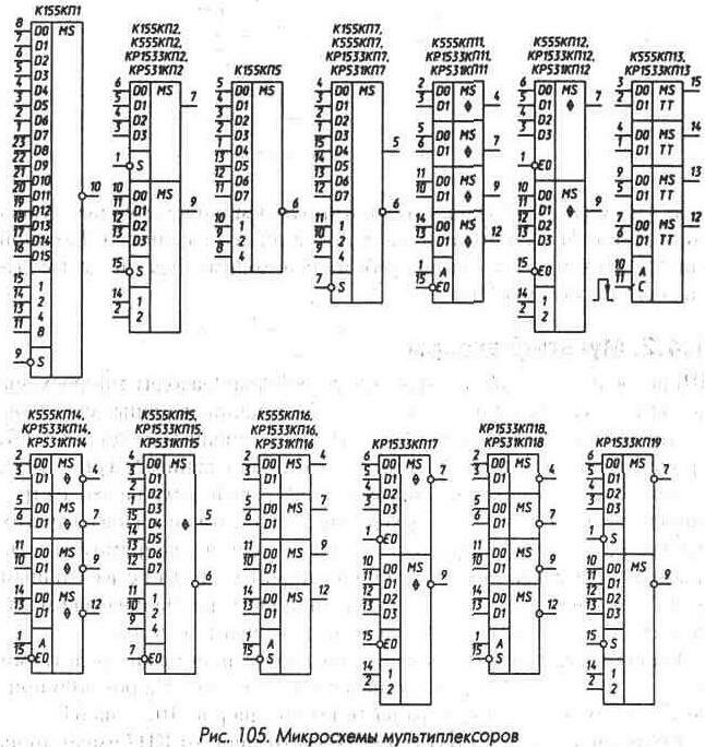 со входов D0 микросхемы, если на адресном входе А лог. 0 и со входов D1, если на входе А лог. 1. -апись в регистр производится по спаду импульса положительной полярности на входе С. Микросхема КП14 (рис. 105) аналогична микросхеме К555КП11, но инвертирует мультиплексируемые сигналы. Микросхема КП15 (рис. 105) - восьмивходовый мультиплексор с прямым и инверсным выходом и с возможностью перевода выходов в высокоимпедансное состояние. При лог. 0 на входе ЕО на выходы проходит сигнал с того входа, номер которого соответствует десятичному эквиваленту кода, поданного на адресные входы 1, 2, 4. На инверсный выход сигнал проходит с инверсией. Подача лог. 1 на вход ЕО переводит и прямой, и инверсный выходы в высокоимпедансное состояние. Микросхема КП16 (рис. 105) - четыре двухвходовых стробируемых мультиплексора. Логика ее работы аналогична логике работы микросхемы КП11, однако подача лог. 1 на вход S переводит выходы микросхемы в состояние лог. 0 независимо от состояния информационных и адресного входов. Микросхема КР533КП17 (рис. 105) аналогична микросхеме КП12, но инвертирует мультиплексируемые сигналы. Микросхема КП18 (рис. 105) аналогична КП16, но инвертирует мультиплексируемые сигналы. Подача лог. 1 на вход S микросхемы устанавливает выход в состояние лог. 1 независимо от состояния других входов. Микросхема КР1533КП19 (рис. 105) функционирует аналогично КП2, но инвертирует мультиплексируемые сигналы. Вход S этой микросхемы действует аналогично такому же входу КП18. Наиболее полный набор мультиплексоров входит в серию микросхем КР1533 - счетверенные мультиплексоры на два входа, сдвоенные на четыре входа и мультиплексоры на восемь входов, причем в каждой из этих групп есть мультиплексоры со стандартным выходом - КР1533КП16, КР1533КП2, КР1533КП17, с инверсным выходом - КР1533КП18, КР1533КП19, КР1533КП7, с выходом с высокоимпедансным состоянием - КР1533КП11, КР1533КП12, КР1533КП15, с инверсным выходом с высокоимпедансным состоянием - КР1533 КП14, КР1533КП17, КР1533КП15. Нагрузочная способность мультиплексоров КР1533КП2, КП7, КП11А, КП12, КП14А, КП15 составляет 12 мА в состоянии лог. 0 при выходном напряжении 0,4 В и 0,4 мА в состоянии лог. 1 при вы
