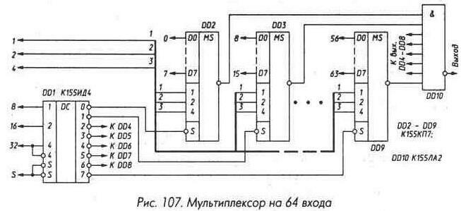 Широкое применение в цифровых устройствах находят микросхемы мультиплексоров, используемые для коммутации двоичных сигналов. Мультиплексор КП7 имеет восемь информационных входов D0 - D7, три адресных входа 1, 2, 4 и вход стробирования S (рис. 105). У микросхемы два выхода - прямой и инверсный. Если на входе стробирования лог. 1, на прямом выходе 0 независимо от сигналов на других входах. Если на входе стробирования лог. 0, сигнал на прямом выходе повторяет сигнал на том входе, номер которого совпадает с десятичным эквивалентом кода на входах 1,2,4 мультиплексора. На инверсном выходе сигнал всегда противофазен сигналу на прямом выходе. Наличие входа стробирования позволяет простыми средствами строить мультиплексоры на большее число входов. На рис. 106 приведена схема мультиплексора на 16 входов, на рис. 107 - на 64. Мультиплексор К155КП5 (рис. 105) в отличие от КП7 имеет лишь инверсный выход и не имеет входа стробирования. Микросхема К155КП1 (рис. 105) содержит четыре адресных входа 1,2,4,8; 16 информационных входов D0 - D15 и вход стробирования S. Выход у этой микросхемы только инверсный. Все свойства и способы включения у нее такие же, как и у КП7. Микросхема КП2 (рис. 105) содержит два мультиплексора на четыре информационных входа D0 - D3 с отдельными входами стробирования, объединенными адресными входами и прямыми выходами. Микросхема КП11 (рис. 105) - четыре двухвходовых мультиплексора с общим управлением и возможностью перевода выходов в высокоимпедансное состояние. При лог. 0 на адресном входе А на выход каждого мультиплексора проходит сигнал со входа D0, при лог. 1 -с входа D1. Выходы микросхемы активны при лог. 0 на входе ЕО. Подача лог 1 на вход ЕО переводит выходы в высокоимпедансное состояние. Микросхема КП12 (рис. 105) - два четырехвходовых мультиплексора с общим управлением и возможностью перевода выходов в высокоимпедансное состояние. На выход каждого мультиплексора проходит сигнал со входа с номером, соответствующим десятичному эквиваленту двоичного кода, поданного на адресные входы 1 и 2. Каждый мультиплексор имеет свой вход перевода выхода в высокоимпедансное состояние ЕО, действующий подобно входу ЕО микросхемы К555КП 11. Микросхема КП13 (рис. 105) - четыре двухвходовых мультиплексора с общим управлением и регистром хранения на выходе (похожа на микросхему КР531ИР20). На входы регистра поступают сигналы