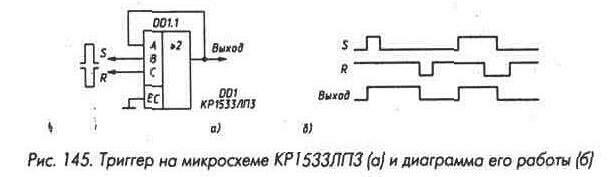 Наличие входа "Управление" позволяет проверить исправность всех блоков и спрогнозировать надежность устройства. Если на этот вход подать лог. 1, мажоритарное резервирование действовать не будет, устройство разделится на три независимых канала: DD1-DD5-DD9, DD2-DD6-DD10, DD3-DD7-DD11, и при контроле выходных сигналов любая неисправность будет обнаружена. В радиолюбительской практике микросхема КР1533ЛП- может найти применение в качестве двухвходовых элементов И при подсоединении третьего входа к общему проводу, в качестве двухвходового элемента ИЛИ при подсоединении третьего входа к плюсу питания. Интересный вариант использования мажоритарного клапана в качестве RS-триггера приведен на рис. 145 (а). Нормально на входе S должен быть лог. 0, на входе R - лог 1. В этом случае триггер может находиться в одном из двух устойчивых состояний. При подаче на вход S лог. 1, по крайней мере, на двух входах мажоритарного клапана будет лог. 1, на выходе появится лог. 1, она сохраняется при восстановлении на входе S лог. 0 (рис. 145, б). Аналогично произойдет переключение триггера в состояние 0 при подаче лог. 0 на вход R. При строго одновременной подаче лог. 1 на вход S и лог. 0 на вход R триггер должен сохранить исходное состояние, но лучше такого варианта подачи сигналов не допускать. |