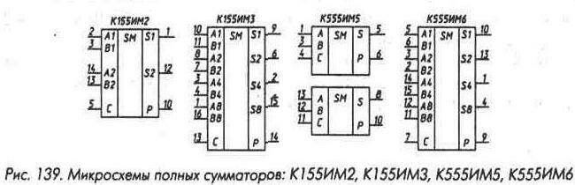 При соединении микросхем К155ИМ1 в многоразрядный сумматор (рис. 138) используется описанное выше свойство симметрии полного сумматора относительно замены входных и выходных сигналов инверсными. В первом разряде входные сигналы подаются на прямые входы DD1, выходной сигнал суммы снимается с прямого выхода S, сигнал переноса - с единственного (инверсного) выхода P. На второй разряд сумматора входные сигналы А и В подаются на инверсные входы, на прямой вход С подается инверсный сигнал переноса с первого разряда, выходной прямой сигнал суммы формируется на инверсном выходе S, выходной прямой сигнал переноса - на инверсном выходе Pинв. Третий разряд сумматора работает так же, как и первый, четвертый - как второй, и т. д. Такое чередование режима работы одноразрядных сумматоров обеспечивает минимальную задержку распространения сигнала в самой длинной цепи - в цепи формирования сигнала переноса. Микросхема К155ИМ2 (рис. 139) представляет собой объединение двух микросхем К155ИМ1, соединенных в соответствии с рис. 138 с исключенными неиспользуемыми инверторами. Микросхема К155ИМ- (рис. 139) соответствует двум микросхемам К155ИМ2, в которых выход переноса первой микросхемы соединен с входом С второй. Микросхема К555ИМ5 - два полных одноразрядных сумматора (рис. 139), каждый из которых имеет три входа (А и В - для подачи двух слагаемых, С - переноса от предыдущего разряда) и два выхода (S - суммы, Р - переноса). Микросхема К555ИМ6 (рис. 139) - полный четырехразрядный двоичный сумматор. Ее логика работы соответствует логике работы микросхемы К555ИМ- - на входы А1 - А8 подается код одного из суммируемых чисел (А1 - младший разряд, А8 - старший), на входы В1-В8 - код второго числа, на вход С - перенос от предыдущей микросхемы. Код суммы формируется на выходах S1 - S8, перенос - на выходе Р. У микросхемы, суммирующей младшие разряды многоразрядных двоичных чисел, вход С следует соединить с общим проводом.