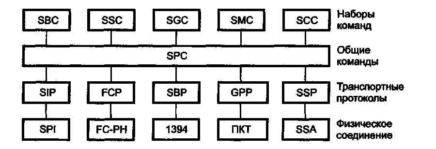 SCSI-3 - дальнейшее развитие стандарта, направленное на увеличение количества подключаемых устройств, расширение системы команд и поддержку Plug and Play. В качестве альтернативы параллельному интерфейсу SPI (SCSI-3 Parallel Interface) появляется возможность применения последовательного, в том числе волоконно-оптического, интерфейса со скоростью 100 Мбайт/с. SCSI-3 существует в виде широкого спектра документов, определяющих отдельные аспекты интерфейса. Архитектурная модель SAM (SCSI-3 Architecture Model) изображена на рис. 5.1. Первичный набор общих команд SCP (SCSI-3 Primary Commands) для устройств различных классов дополняется набором команд со-