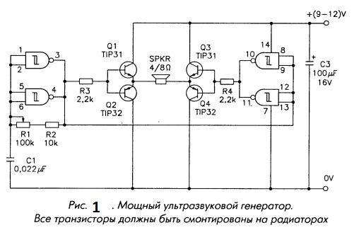 Ультразвуковой режим работы достигается при величине емкости С1 от 470 до 2200 пФ. Для сигнала звукового диапазона требуется емкость в диапазоне 0,01–0,022 мкФ.