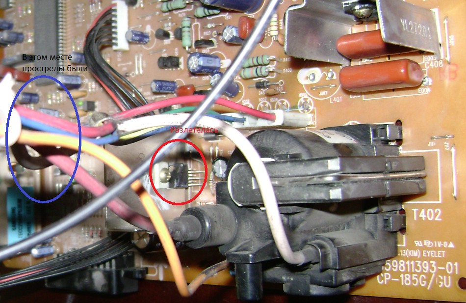 Началось всё с прострелов высоковольтного кабеля. Сначала редкие прострелы а потом начало прошивать. Когда обнаружил место пробоя, развёл провода подальше друг от друга и через пару секунд конкретный прострел и разлетелась микросхема кадровой развёртки.
