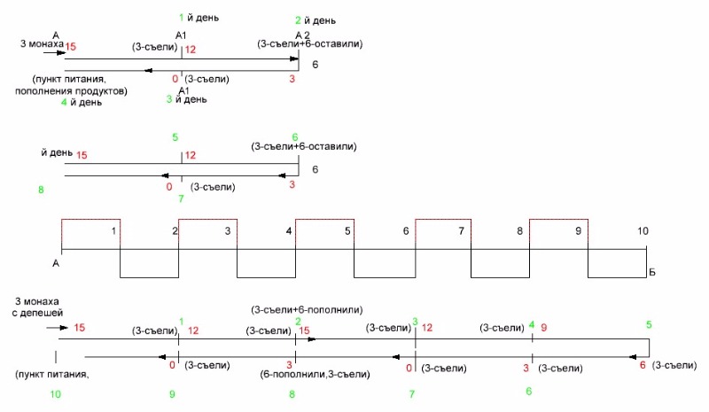 Вообще - то такой хреновеной никогда не занимался, в качестве эксперимента попробую. В путь отправляются 6 монахов. Двое из них спят по 8 часов, по очереди, остальные несут их (везут на тачке, если хотите). Таким образом их скорость передвижения увеличится в 2 раза. Послание будет доставлено за 5 дней и никто из монахов голодать не будет. Это видно из приведённого чертежа.