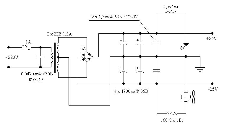 Блок питания для 2-х таких усилителей, для 6 нужно или 3 таких или трансформатор в 300 вт. Конденсаторы электролитические по 30000 в каждом плече , диоды ампер на 20. И провода с палец толщинойwgmcc пишет: А ка мне подключить 6 таких усилителей, и как сделать блок питания..???