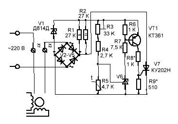 Схема будет работать так же, как и в описании по ссылке. с той лишь разницей, что при включении тиристора, напряжение со схемы снимется. Так будет с каждым полупериодом. Пока температура холодильника выше нормы. Если опустится ниже нормы, тлка открываться не будет, тиристор перестанет включать компрессор. Терморезистор типа ММТ-4.