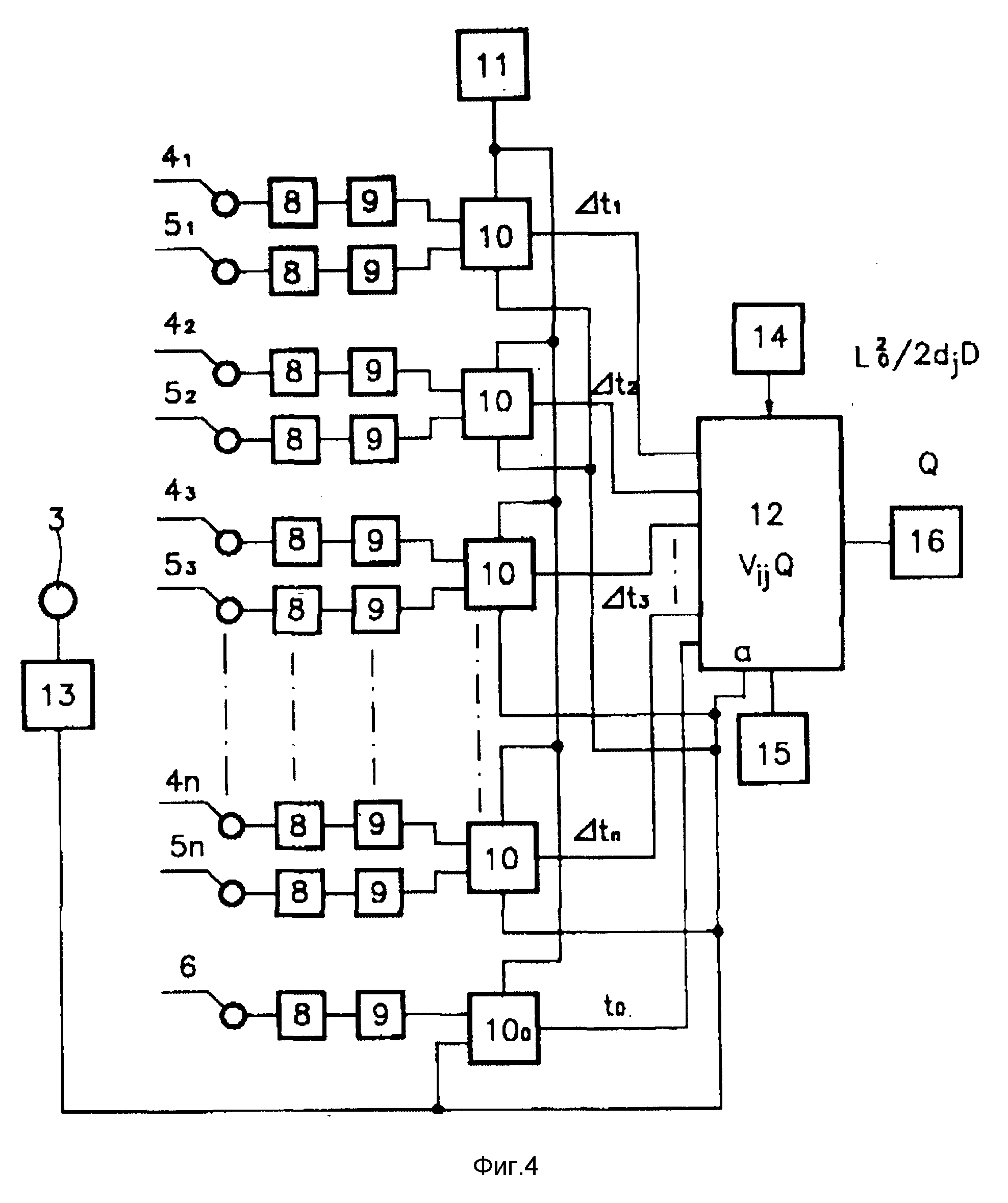 В соответствии с изобретением микропроцессор 12 измеряет временные разности (или Ni) на всех каналах, когда вибратор 3 излучает ультразвуковые волны, и запоминает их в своем запоминающем устройстве. Одновременно измеряется время to распространения от вибратора 3 до приемников 4i и 5i и полученные значения подаются в микропроцессор 12. Микропроцессор 12 запоминает постоянную величину L02/2d, внутренний диаметр D трубы, длины и координаты хорд и т.д., ранее введенные из устройства 14 ввода, которые требуются для измерения скорости потока Vi и вычисления скоростей потока и расходов на различных хордах.