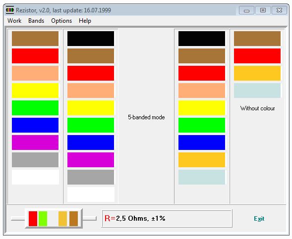 Описание: Предназначена для определения номинала резистора по цветным полосам, нанесенным на него. Поддержка 5 полосной маркировки.