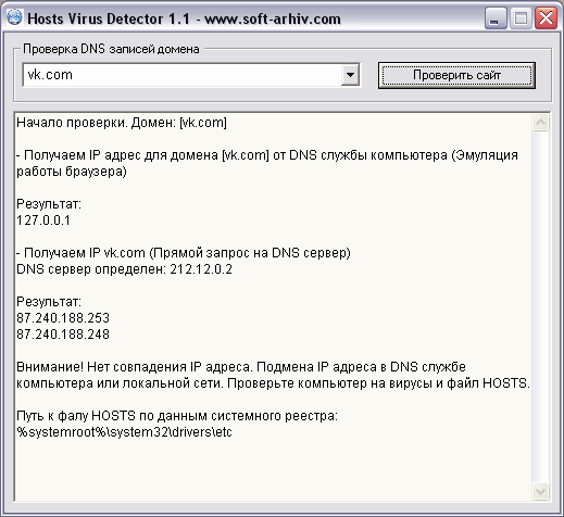 С помощью простой и бесплатной сетевой утилиты Hosts Virus Detector можно быстро узнать причину проблемы с входом на сайт. Если на компьютере работает вирус, подменяющий IP адрес и блокирующий вход на сайт, программа это отследит и выдаст результат.