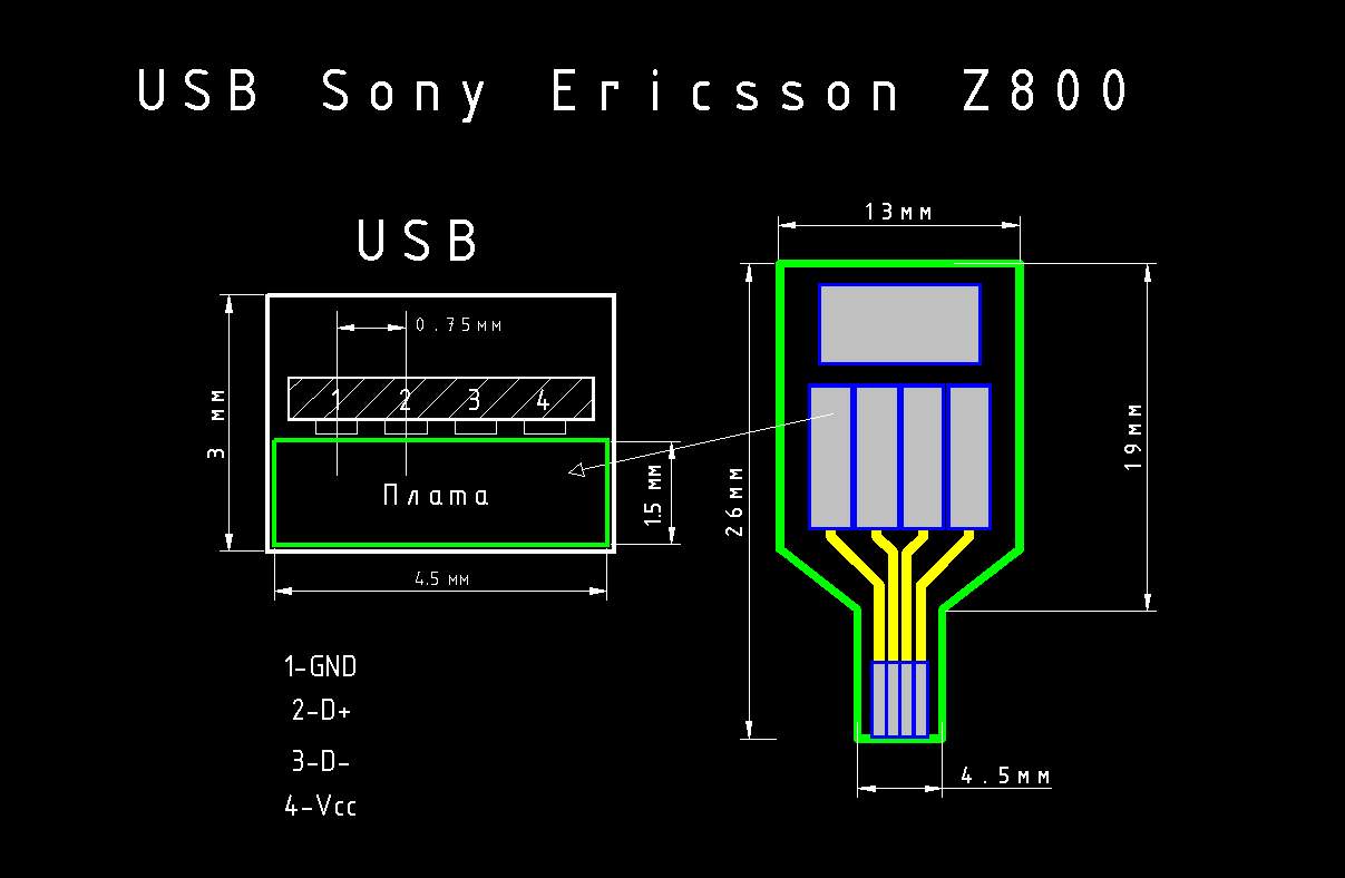 Давно знал что в моем телефоне есть USB, но вот найти кабель немог, даже информации по такому типу разъема нигде нету (разъем даже меньше чем Mini-USB). После недолгих измерений штангелем, нарисовал плату и лазерно утюжным способом ее сделал, выкладываю файл с рисунком и распиновкой разъема. Рисунок платы у меня в PCAD 2004, если кому нужно выложу. Драйвера для USB лежат на сайте www.sonyericsson.ru . Если у кого есть вопросы, задавайте, отвечу!