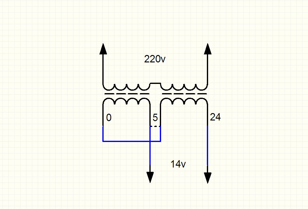 ну теперь смысл понятен, т.е. чтобы получить 14В нужно начало обмотки 19В спаять с началом обмотки 5В(с точкой 0) и забирать с концов 5В и 19В?