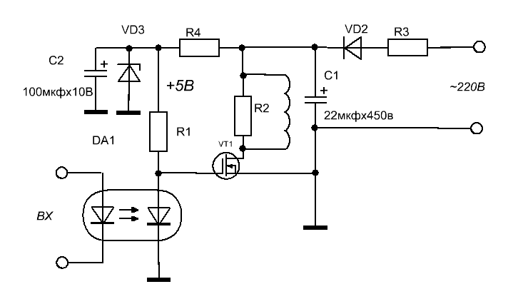 сорри, я в схемке напутал - резистор R1 нужно подключить между общим выводом и катодом фотодиода оптопары, к катоду подключить затвор транзистора, а на анод фотодиода подключить напряжение +5В.