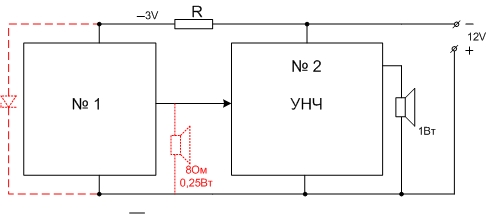 Есть схема (издает звук типа сирены) на рис. № 1 и УНЧ на рис № 2. Усилитель питается от 12 вольт, схема № 1 от 3 вольт. Раньше эта схема нагружалась динамиком на 8Ом 0,25Вт (на рисунке показано пунктиром), но звук был тихий. Хочу усилить УНЧ. Как рассчитать сопротивление резистора R, чтоб понизить напряжение до 3 вольт для схемы № 1 и может еще нужен стабилитрон (показан пунктиром) ? Заранее спасибо за ответ.