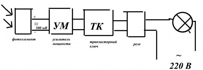 При попадании света фотоэлемент выдает 500 мВ, усилитель усиливает до напряжения открытия транзистора, ТК открывается, течет ток через реле, реле замыкает контакты и свет включаеться.