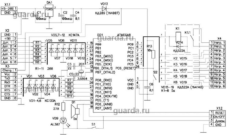 Да действительно D1...D6 невлияют на передачу команд с телефона в МК. Я пробовал их отключать.Что касается питания МК то он запитан от АКБ сотового,гдеU= на данный момент 3,7В.У меня складывается впечатление,что в режиме охраны МК не контролирует ( не опрашивает ) датчики. Они посажены на общую шину и при ее разрыве на входах МК появляется +3,4B.В зависимости от номера сработавшего датчика МК должен сделать дозвон и отправить СМС за таким же номером из SIM телефона на телефон хозяина, чего не происходит.Может что то с установкой фьюзов не то, что он не работает с внешним кварцем и поэтому не опрашивает датчики.Так же очень благодарен,что находите пару минут поломать со мной голову.C уважением Юрий.