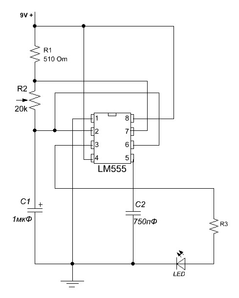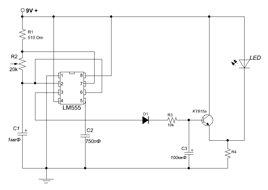 И вторая новость, хорошая: перекапывал тут интернет все на ту же тему мигающей гирлянды и нашел схему мигающего фонарика на 555 таймере.
