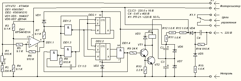 На микросхеме DD2 и элементах D1.2 и D1.4 собран счётчик импульсов с логикой управления и цепями сброса. При высокой освещённости фоторезистора на выходе DA1 присутствует логическая 1, разрешающая работу генератора и счётчика DD2. , включённого как 8 - разрядный двоичный счётчик. После 192 - х импульсов (128+64) на выходе элемента DD1.4 будет присутствовать логический 0, который запретит работу генератора и отключит реле К1. Освещение отключится.