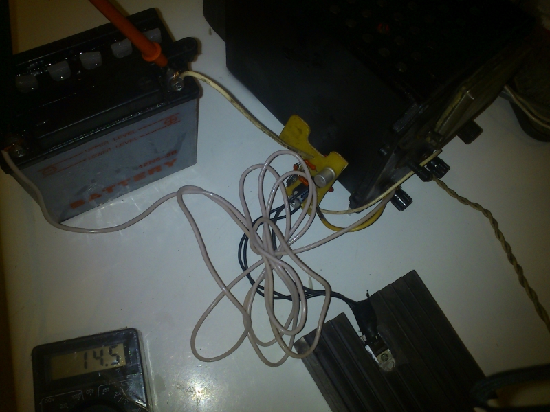 Аккумулятор полностью разряжен 8В, при напряжении заряда 14,4В ток 2,8А по мультиметру. Мой трансформатор оказался слабым чтобы выдать такой ток, поэтому за источник питания взял зарядное от машины. Уменьшил ток до 1А, чтоб не кипел сильно.