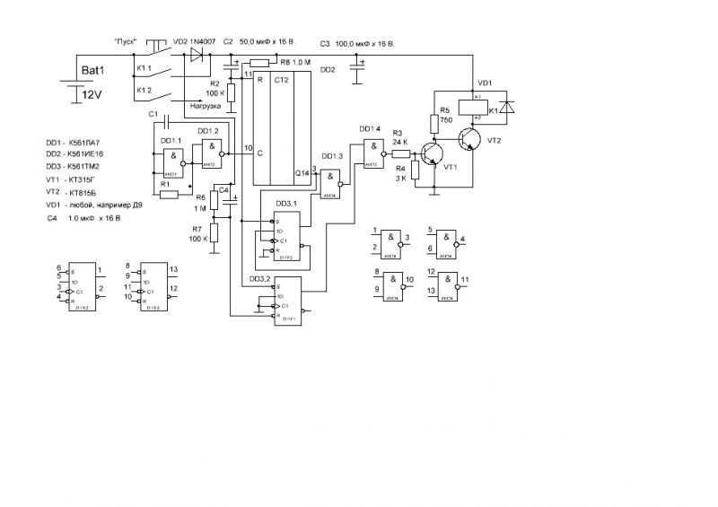 Если не дождавшись автоматического отключения реле, нажать кнопку "Пуск" повторно, начнёт вновь заряжаться конденсатор С4, который уже успел разрядиться через резистор R6. На резисторе R7 появится 1, которая через вход R, установки 0, установит триггер DD3,2, в состояние 0. 0, воздействуя на элемент DD1,4, откроет транзистор VT1. Это так же приведёт к отключению реле, нагрузки и схемы от аккумулятора.