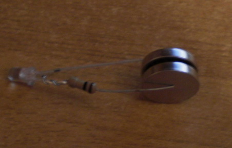 У меня есть простейшая конструкция - светодиод, резистр и батарейки. Фото прилагается(на фото светодиод не горит, ибо батарейки сели).