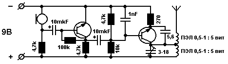 Принимать сигнал жука лучше всего на ФМ-сканеры, так как в процессе длительной работы частота передаваемой волны может понижаться, а сканеры продолжают держать эту волну. В общем, самое время взглянуть на схему. Состоит данное устройство из 2 частей: Усилитель ЗЧ и задающий генератор. Если в схему добавить усилитель мощности, то дистанцию можно будет увеличить до 1 км (по это как-нибудь в другой раз). Сначала собираешь УЗЧ (микрофон, 2 резистора по 4,7 КОм, и один на 100 КОм, а также транзистор и емкость 10мкФ). Если следить по схеме, то смотреть нужно слева - направо. Затем нужно все проверить - конектишь наушники к выходу конденсатора (тот что отрицательный) и к минусу всей схемы. Не забудь подключить батарейку. Затем что-нибудь побубни в микрофон - в наушниках должен услышать. Если ты ничего не слышал, то ты или глухой или напутал в схеме. А если полный SUCCESS, то продолжай операцию. Собираешь после задающий генератор (то есть достраиваешь схему до конца). Детали такие: Резисторы: 10 КОм, 4,7 КОм, 270 Ом; Емкости: 10 мкФ, 1 наноФ, 5,6 пикоФ, и переменная, работающая в диапазоне от 3 до 18 пикоФ. Но ее вполне можно заменить постоянной емкостью, емкость которой попадает в этот промежуток (3-18 пФ). Транзисторы можно применить такие: С945 или КТ3102 - левый на схеме; КТ3102 - правый на схеме. Катушки индуктивности можно намотать на стержне обычной шариковой ручки из медного провода диаметром от 0,5 до 1 мм. В каждой катушке сделать по 5 витков. Антенна - кусок провода, или еще что-нибудь похожее на это длинной 70 см. Микрофон можно взять малогабаритный "Сосна", также работает и с ДЭМШ 1-А. Все! Конекти девайс к батарейке или к аккумулятору и шагай творить дела. Желаю удачной сборки.