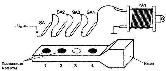 Замок состоит из четырех герконов SA1, SA2, SA3, SA4 и электромагнита YA1. Причем, герконы SA1, SA2, SA4 имеют нормально разомкнутые контакты, а геркон SA3 - нормально замкнутые. Герконы могут устанавливаться в произ-вольной последовательности, количество их может быть различным, что способствует повышению секретности замка. Замок и ключ имеют следующую конструкцию .