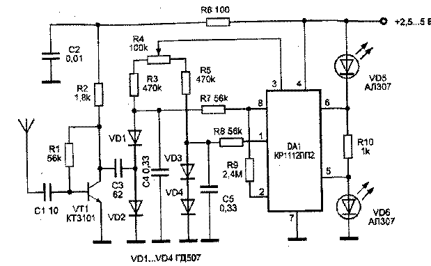 Простой малогабаритный детектор жучка с индикацией на двух светодиодах