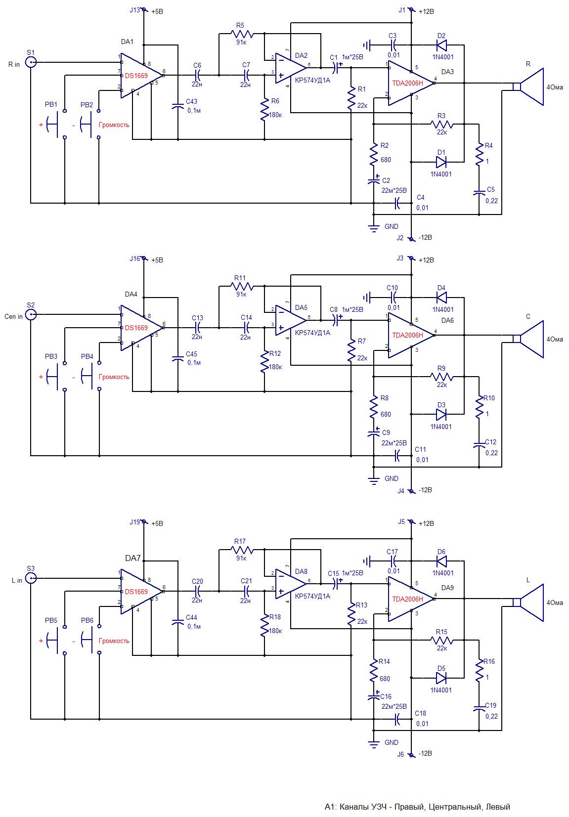 Предлагаю вашему вниманию схему усилителя, для реализации компьютерной акустической системы стандарта 5.1, среднего класса, наподобии Top Device, JetBalance, для подключения к двуполосным АС. Извиняюсь за неправильную последовательность маркировки компонентов, так как идеи по улучшению приходили в процессе разработки. Идею с цифровой кнопочной регулировкой звука, взял со своей акустики Top Device. В промежуточном звене усилителя, установил активные фильтры на ОУ, для защиты оконечных усилителей от перегрузки ненужными частотами и более ровного звучания.