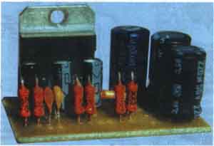 | Детали усилителя смонтированы на печатной плате (рис. 3) из двустороннего фольгированного стеклотекстолита размерами 50x35 мм, плата в сборе показана на рис. 4. Для монтажа использованы резисторы МЛТ-0.25, конденсаторы С4— С7, СЮ — импортные аналоги К50-35 и К73-17 (остальные). В качестве SA1 применим любой малогабаритный кнопочный выключатель. | ![]() |