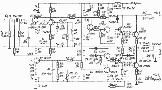 Малые нелинейные искажения и высокая стабильность усилителя обусловлены в основном ООС, охватывающей выходной каскад. Напряжение обратной связи снимается с делителя R25R26 и подается на вход каскада через транзистор V13. Это требует увеличения тока покоя транзисторов V8, V13 до 25 мА и установки их, как и транзисторов V15-V18 , на теплоотводе. Цепи L4R48 и C12R49 выравнивают нагрузку выходного каскада на высоких частотах.