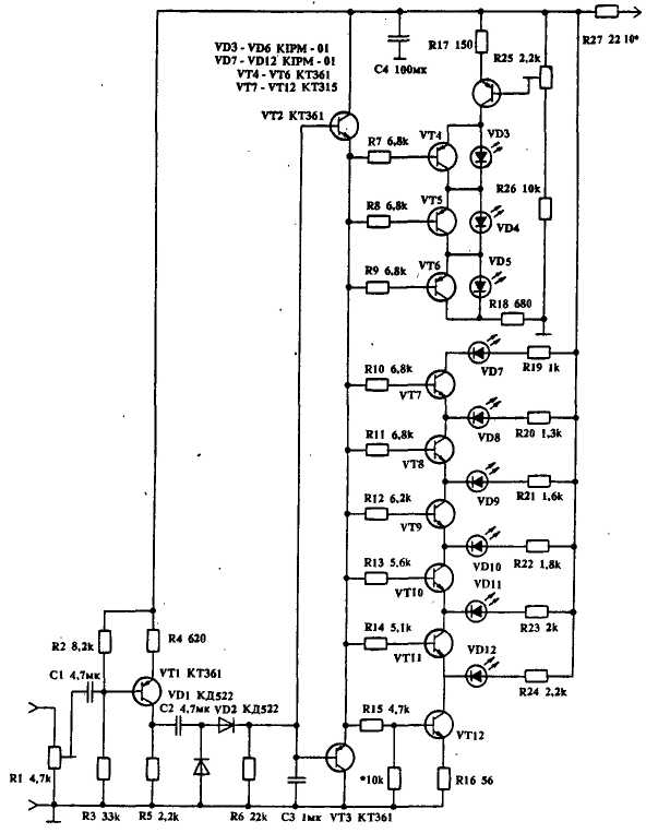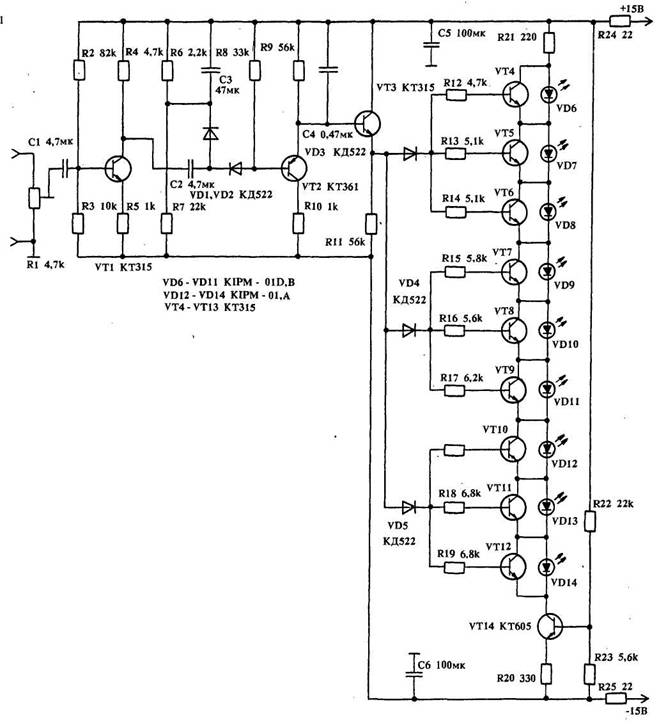 На рис. 1 представлена схема в переработанном виде для двухполярного питания +15 В. Индикатор имеет линейную шкалу (в случае применения" светодиодов одного цвета) и небольшое потребление тока, так как все светодиоды включены последовательно. Подбором делителя R6, R7 устанавливают порог чувствительности. В качестве светодиодов VD6 ≈ VD11 применены мнемонические индикаторы типа КИПМ-01Д зеленого свечения, VD12 ≈ VD14 ≈ КИПМ-01Б красного свечения.
