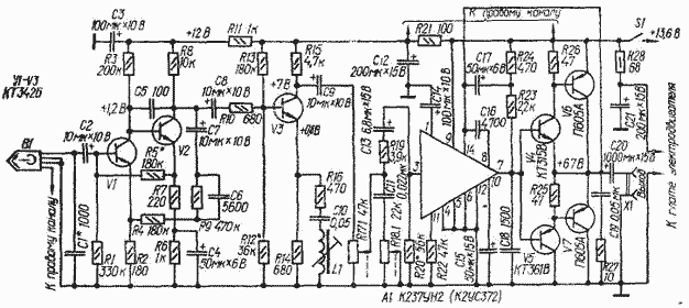 Налаживание проигрывателя сводится к проверке и, если необходимо, установке режимов работы транзисторов V1, V2 (подбором резистора R5*), V3 (R12*) и V4-V7 (R20*), а также настройке контуров LB1C1 и L1C10 на частоту 14 кГц.