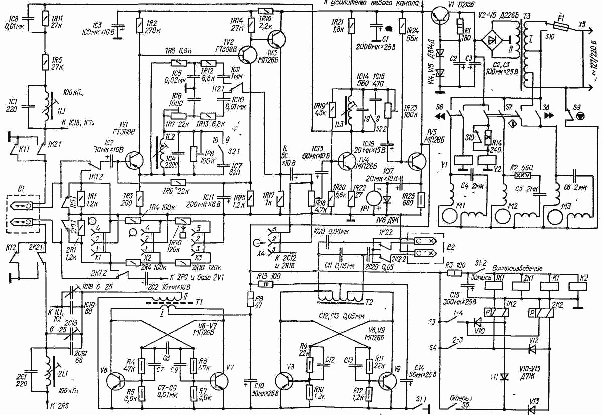 Уровень записи регулируют сдвоенным переменным резистором 1R18, 2R18. Перевод магнитофона из режима записи в режим воспроизведения, и наоборот, осуществляется с помощью реле 1K1, 2К1, К1 и К2, управляемых переключателем S1; выбор дорожек при монофонической записи, а также переключение магнитофона в стереофонический режим - переключателями S3-S5, управляющими через диодную матрицу (V10-V13) работой поляризованных реле 1К2, 2К2, выбор скорости ленты - переключателем S2. Переключатели S6-S9, электромагниты Y1 (прижимной ролик) и Y2 (тормоз подающего узла) служат для управления лентопротяжным механизмом.