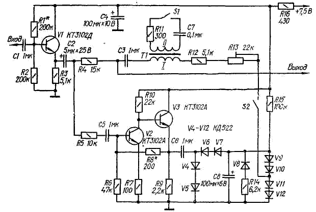 Устройство состоит из эмиттерного повторителя (VI) и канала формирования управляющего сигнала, содержащего двухкаскадный усилитель (V2, V3) и выпрямитель (V4-V7). Сигнал на вход усилителя ЗЧ поступает с нагрузки эмиттерного повторителя через делитель напряжения, состоящий из резистора R4 и элементов СЗ, T1, R12, R13, V9-V12 Элементы СЗ, T1, R12, R13 образуют фильтр, АЧХ которого имеет подъем на средних частотах, обусловленный резонансом контура, состоящего из вторичной обмотки трансформатора Т1, конденсатора С7 и резистора R7. При малых сигналах и в паузах фильтр фактически соединен с общим проводом через небольшое прямое сопротивление открытых диодов V11, V12, поэтому низко- и высокочастотные составляющие проходят на выход значительно ослабленными. С ростом уровня сигнала на выходе выпрямителя (V4-V7) появляется напряжение отрицательной полярности, которое закрывает диоды V9-V12, и фильтр отключается от общего провода. В результате весь спектр сигнала проходит на вход усилителя ЗЧ.