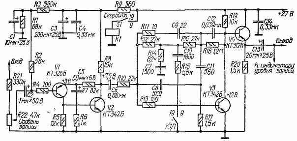 Усилитель (на рисунке показана схема одного из каналов) состоит из предварительного (V1, V2) и оконечного (V3, V4) усилителей. Первый из них имеет линейную АЧХ и служит для согласования устройства с источниками сигнала (при выходном напряжении 100...200 мВ их подключают ко входу предварительного усилителя через резисторы сопротивлением 300...390 кОм). Оконечный усилитель создает необходимые предыскажения записываемого сигнала. Подъем АЧХ на высших частотах определяется сопротивлениями резисторов R14, R15, а ее ход в области низших частот - сопротивлениями резисторов R12, R 6 и емкостью конденсатора С12. Для переключения цепей формирования АЧХ применено реле РЭС-47 (паспорт РФ4.500.508П2 или РФ4.500.417П2).