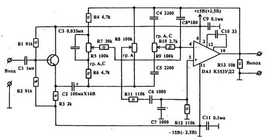 В основу регулятора тембра, схема которого приведена на рисунке, положена разработка, опубликованная в книге "Конструирование дополнительных устройств к магнитофонам" (И.Боздеха. М. Энергоатомиздат, 1981 г., стр.91).