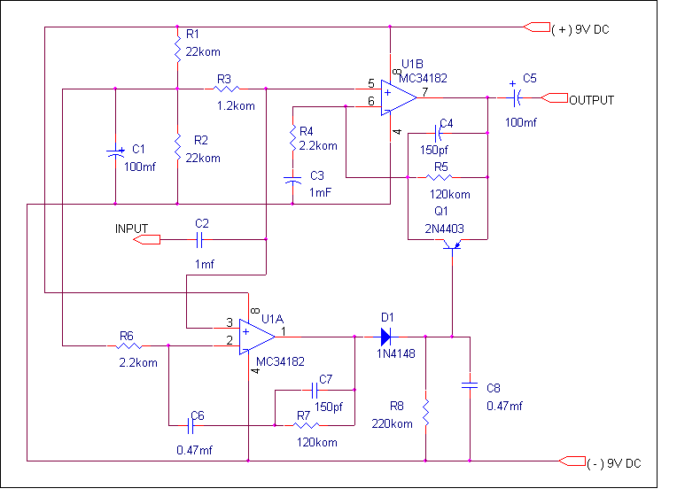 Усилитель с переключаемым коэффициэнтом усиления может найти широкое применение в системах громкоговорящей связи. Такие усилители в режиме молчания должны обеспечивать подавление паразитных помех. С этой целью в схему вводят пороговое устройство, изменяющее коэффициэнт усиления усилителя от минимального до максимального, когда уровень низкочастотного сигнала превышает в заданное число раз уровень существующих помех. Схема порогового устройства, приведённая на рисунке содержит пороговый усилитель низкой частоты, пиковый детектор, электронный ключ. Схема должна производить переключение коэффициэнта усиления без щелчков и без ощутимых искажений речевого сигнала. Приведённа схема устройства на операционном усилителе, снабжённым пороговым устройством, которое изменяет коэффициэнт усиления от единичного до номинального, когда напряжение на его входе превышает уровень 30 mV.