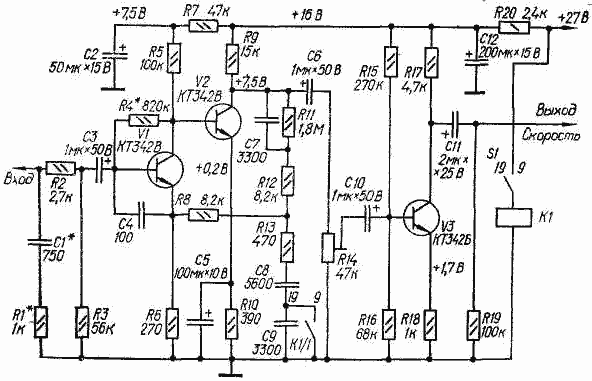 Для уменьшения шумов транзистор V1 работает с небольшим коллекторным током. Корректирующие элементы включены в цепь ООС R8R11-R13C7-С9, охватывающую первые два каскада. Дополнительную коррекцию сигнала (на высших частотах) можно получить подбором конденсатора С1* и резистора R1*, настроив контур, образованный ими и обмоткой магнитной головки, на частоту 24...25 кГц. Для переключения корректирующих цепей при переходе с одной скорости ленты на другую служит реле К1 типа РЭС-47 (паспорт РФ4.500.408П2 или РФ4.500.417П2).