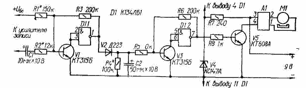С началом записи переменное напряжение, снимаемое с выхода инвертора D1.1, выпрямляется диодом V2 и открывает транзистор V3. В результате на выходе инвертора D1.2 появляется постоянное напряжение. Оно открывает транзистор V5, и тот замыкает цепь питания двигателя Ml. С наступлением паузы конденсатор С2 начинает разряжаться через резистор R4* и соединенные последовательно резистор R5 и эмиттерный переход транзистора V3. Через 3...5 с транзистор V3, а затем и транзистор V5 закрываются, и двигатель останавливается. В режимах перемотки и воспроизведения устройство срабатывает от постоянного напряжения, поступающего на вход через резистор R1.