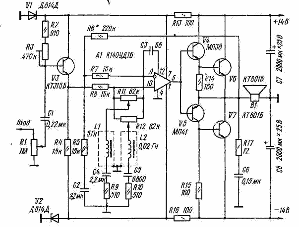 Усилитель состоит из входного эмиттерного повторителя на транзисторе V3; усилителя напряжения сигнала с регулятором тембра на операционном усилителе (ОУ) А1 и выходного каскада на транзисторах V4-V7.