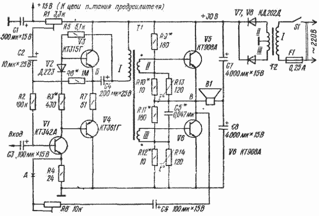 Усилитель содержит двухкаскадный усилитель напряжения сигнала на транзисторах VI, V3, V4 и оконечный каскад на транзисторах одинаковой структуры V5, V6 Нагрузка - громкоговоритель В1 - включена в диагональ моста, образованного транзисторами V5, V6 и конденсаторами С7, С8, что позволило улучшить амплитудно-частотную характеристику (АЧХ) в области низших частот.