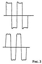 На транзисторах VT1, VT2 собран составной эмиттерный повторитель, он же фазовращатель при замкнутых контактах переключателя S2. Применение фазовращателя желательно при обработке сигнала магнитофона, т.к. из-за дифференцирующего действия магнитная головка при воспроизведении вносит фазовые искажения.Наиболее наглядно это видно при воспроизведении сигнала прямоугольной формы. На рис.2 и 3 изображены осциллограммы сигнала частотой 1 и 4 кГц на выходе усилителя воспроизведения соответственно без фазовращателя и с фазовращателем.