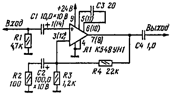 Микросхема в данном случае включена по схеме неинвертирующего усилителя с использованием одного транзистора дифференциального каскада, что, как уже говорилось, уменьшает уровень шумов.
