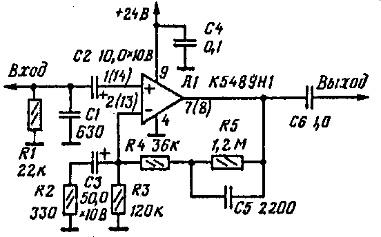 Как видно из рис. микросхема К548УН1 включена в данном случае по схеме неинвертирующего усилителя с использованием обоих транзисторов дифференциального каскада. Требуемая коррекция АЧХ обеспечивается частотнозависимой цепью R4R5C5. Постоянная времени коррекции - 75 мкс - задана параметрами резистора R4 и конденсатора С5. Для коррекции АЧХ в области высших частот рабочего днапаэона частот служит конденсатрр С1, образующий вместе c индуктивностью магнитной головки колебательный контур, настроенный на частоту 18...20 кГц.