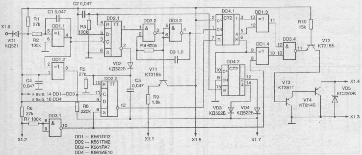 Если теперь открыть дверь водителя, триггер DD2.2 переключится в единичное состояние и низкий уровень с его инверсного выхода разрешит работу счетчика DD4.1 Сигналы с его выходов 1 и 4 поступают на входы элемента DD1.3 — сумматора по модулю 2. Если сторож не выключить через 6 с, на выходе 8 счетчика DD4.1 появится высокий уровень, которым через элемент DD1.4 откроется элемент DD3.4. Сигнал с выхода сумматора DD1.3 поступает на коммутатор тока, собранный на транзисторах VT2 — VT4 и управляющий включением реле звукового сигнала К1. При срабатывании реле зазвучит тревожный сигнал с определенным "рисунком": короткий-длинный-короткий. Длительность короткого сигнала равна половине длинного. Такие серии сигналов повторяются с интервалом 7,5 с.
