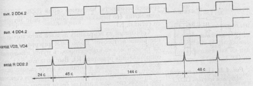 Повторная попытка открыть дверь приведет к тому, что через 6 с зазвучит сигнал тревоги, но, поскольку счетчик DD4.2 не установлен в нулевое состояние, высокий уровень на его выходе 2 появится только через 48 с. Длительность сигнала будет в два раза больше (рис. 3). При третьей попытке открыть дверь автомобиля положительный перепад в точке соединения диодов VD3 и VD4 появится только через 144 с и прозвучит 12 серий тревожных сигналов. При последующих попытках — тревожный сигнал будет повторяться то из четырех, то из двенадцати серий.