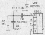 Собранный из исправных деталей автосторож настройки не требует. Временные интервалы сигнала треноги можно корректировать путем изменения сопротивления резистора R4. Выключатель SA1 должен быть установлен в потайном месте салона автомобиля, а светоднод HL1 — перед лобовым стеклом так, чтобы световые сигналы были видны снаружи. Маятниковый датчик качания кузова автомобиля можно подключить параллельно контактам SB1, однако в момент закрывания двери водителя из-за вибрации кузова может преждевременно зазвучать тревожный сигнал. Чтобы исключить это явление, автосторож следует дополнить цепью временной задержки триггера ГШ2.2 (рис.5). На печатной плате предусмотрена возможность установки этих дополнительных элементов. При отсутствии датчика качания вместо резистора R11 и конденсатора С6 устанавливают перемычки. При указанных номиналах временная задержка перехода автосторожа в режим охраны после закрывания двери водителя равна примерно 18с, что вполне достаточно для успокоения датчика.